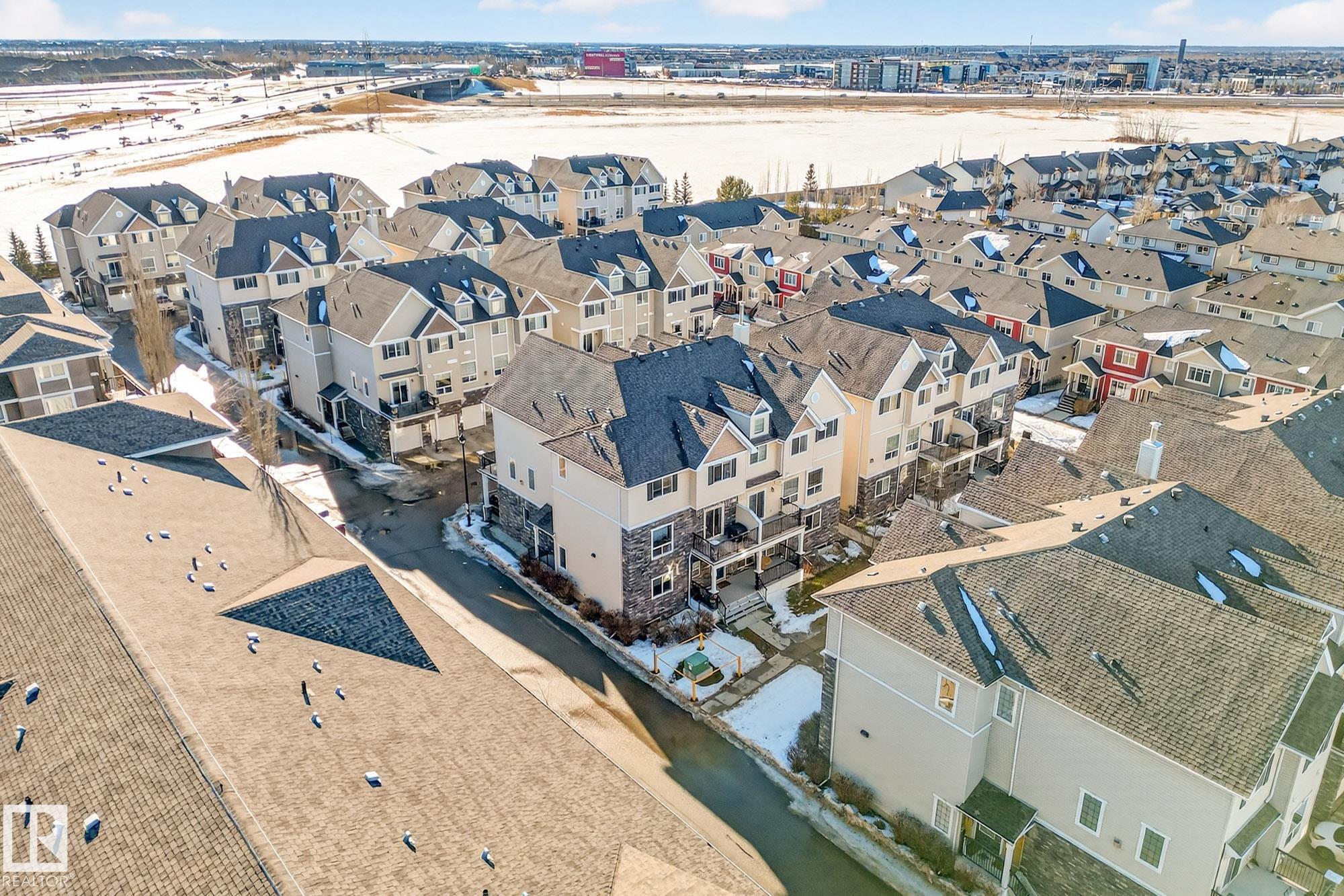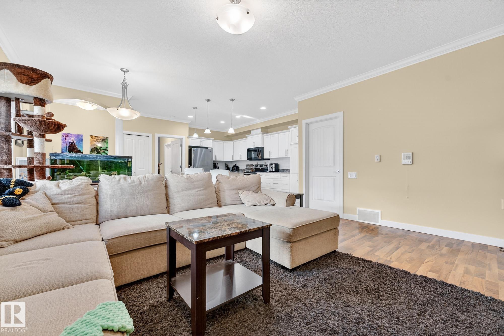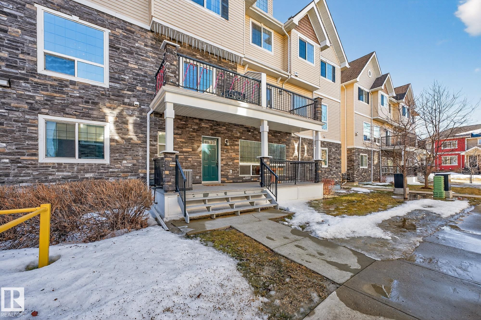 Nestled in a quiet southwest Edmonton community, this thoughtfully designed bungalow-style townhouse offers an inviting open layout ideal for both everyday living and hosting. The modern kitchen is a standout, showcasing stainless steel appliances, sleek cabinetry, generous counter space, and a central island with seating. The dining space overlooks the front veranda and yard, flowing seamlessly into a warm living area highlighted by a gas fireplace. The primary bedroom includes a walk-in closet and a private three-piece ensuite, while the second bedroom is positioned on the opposite side of the home for added privacy, adjacent to another full three-piece bathroom. A dedicated laundry room on the main floor provides direct access to the attached single garage. Downstairs, the fully developed lower level expands your living space with a large recreation room and an additional four-piece bathroom. An exceptional opportunity to enjoy comfort, function, and tranquility in a beautiful setting.