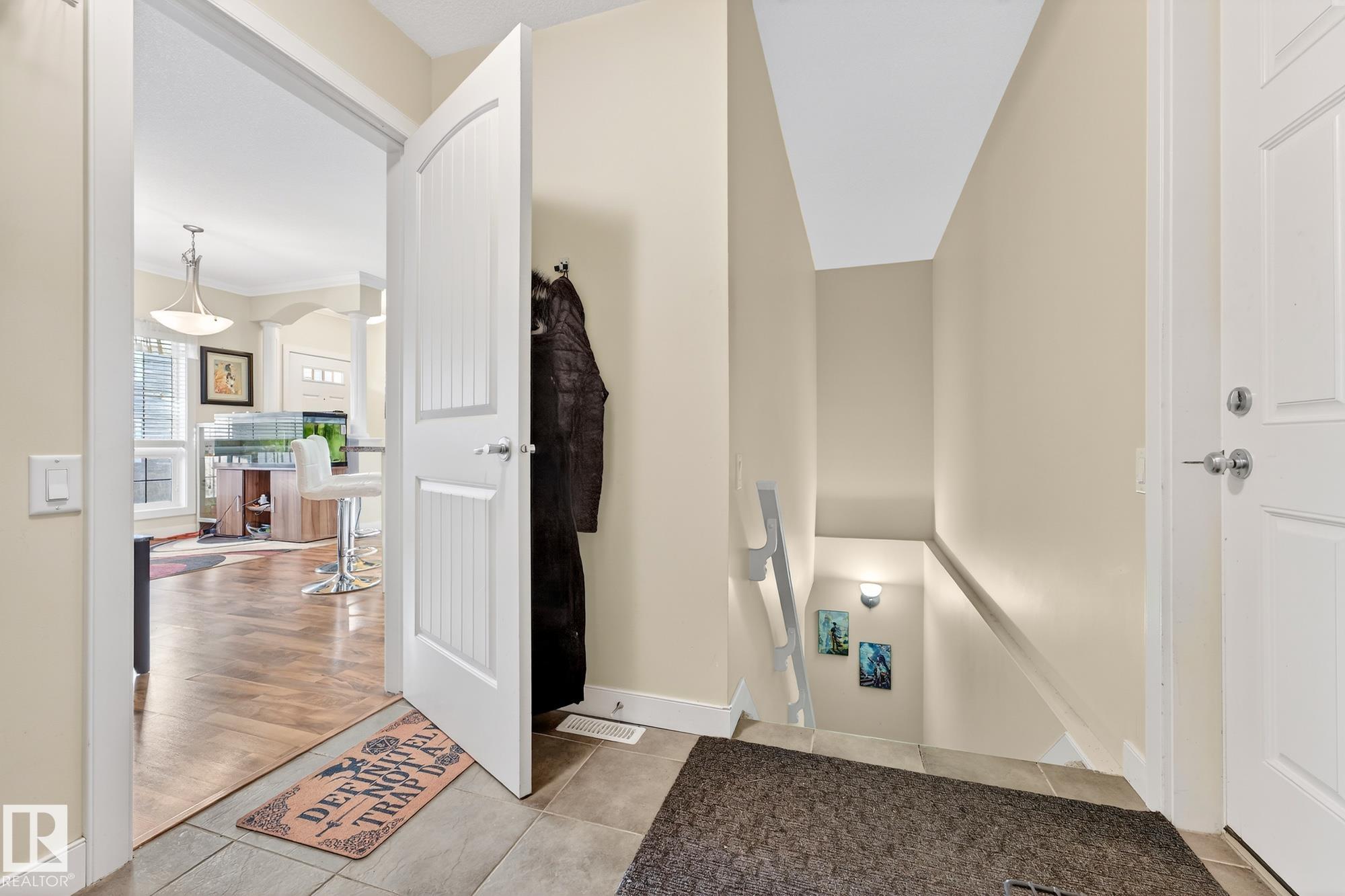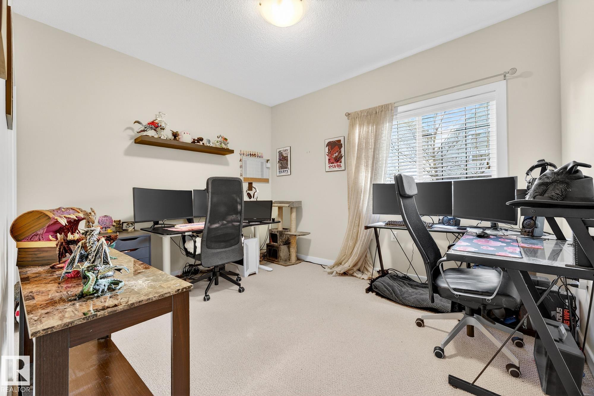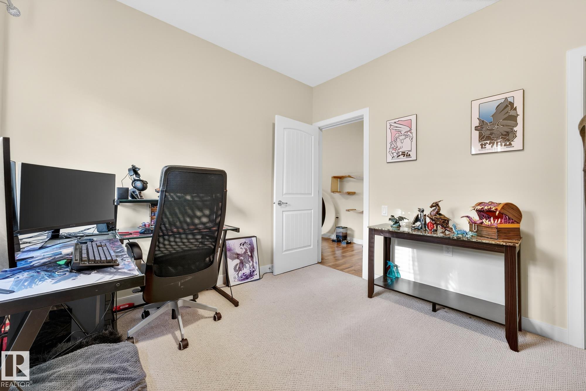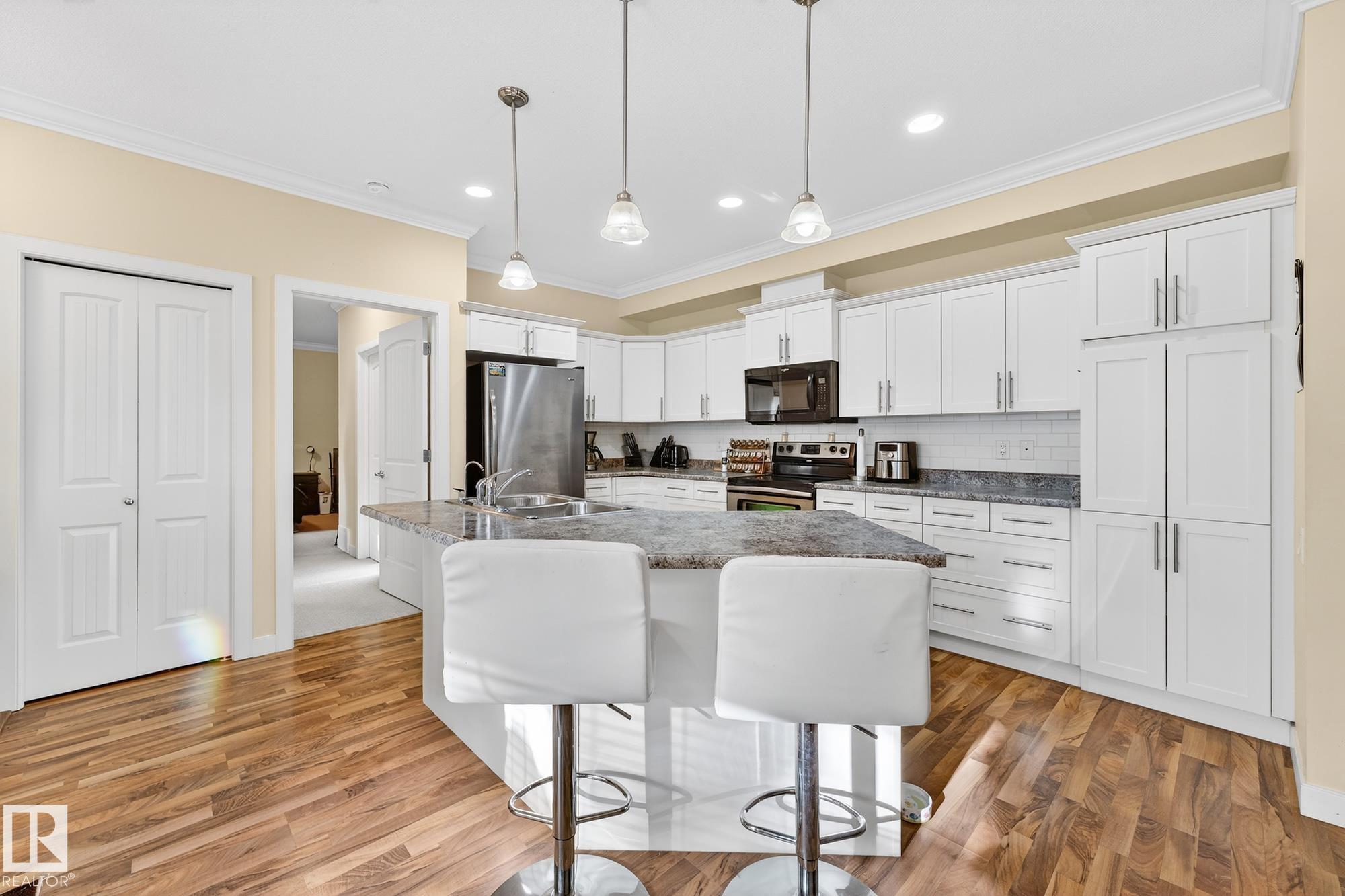 Nestled in a quiet southwest Edmonton community, this thoughtfully designed bungalow-style townhouse offers an inviting open layout ideal for both everyday living and hosting. The modern kitchen is a standout, showcasing stainless steel appliances, sleek cabinetry, generous counter space, and a central island with seating. The dining space overlooks the front veranda and yard, flowing seamlessly into a warm living area highlighted by a gas fireplace. The primary bedroom includes a walk-in closet and a private three-piece ensuite, while the second bedroom is positioned on the opposite side of the home for added privacy, adjacent to another full three-piece bathroom. A dedicated laundry room on the main floor provides direct access to the attached single garage. Downstairs, the fully developed lower level expands your living space with a large recreation room and an additional four-piece bathroom. An exceptional opportunity to enjoy comfort, function, and tranquility in a beautiful setting.