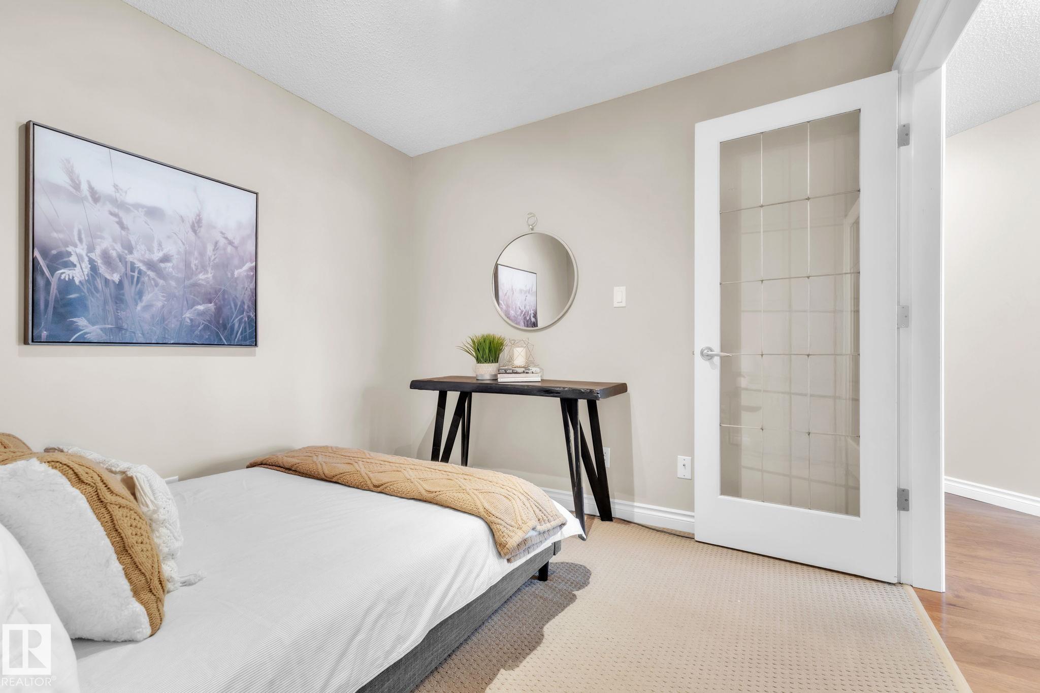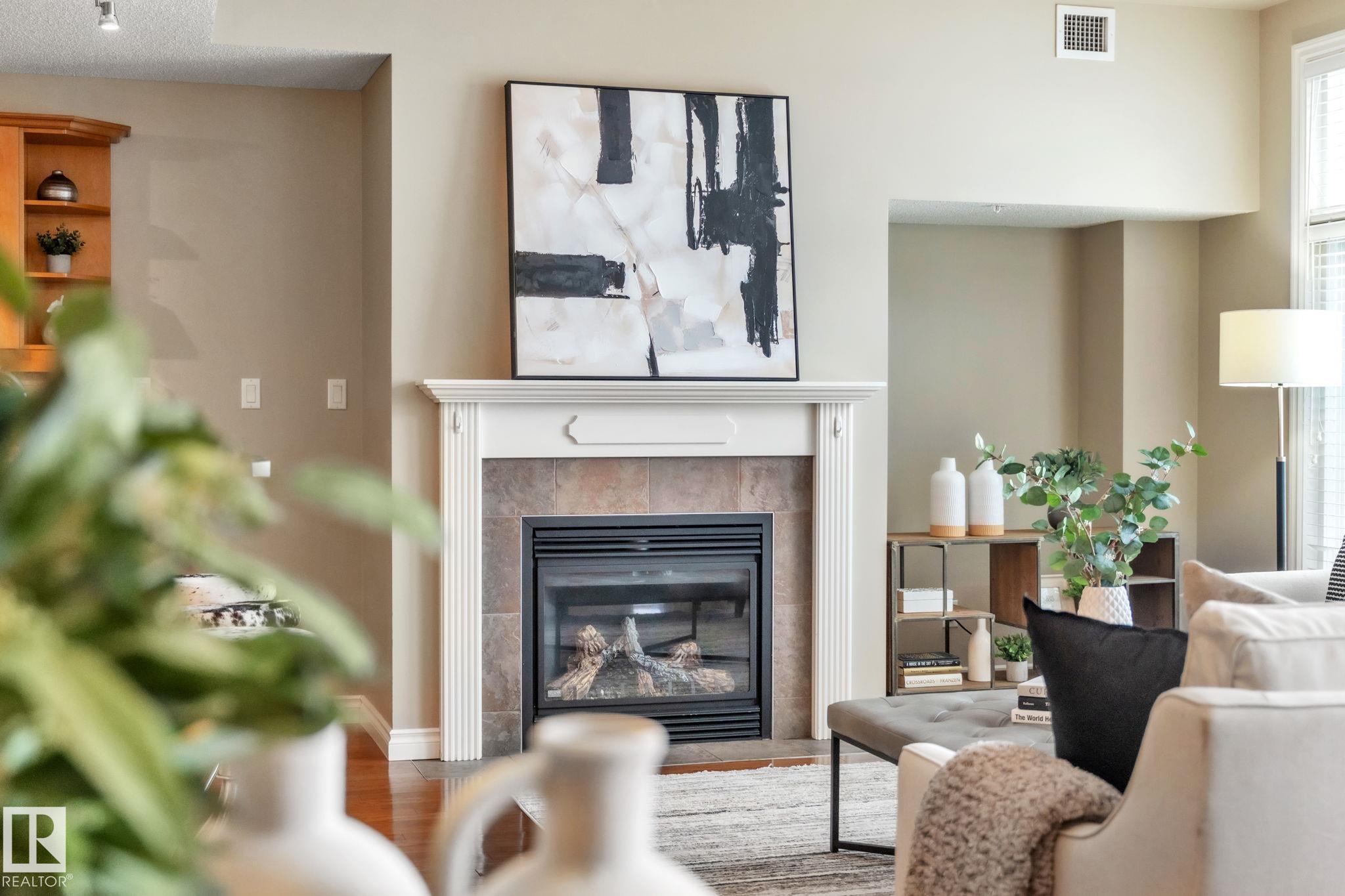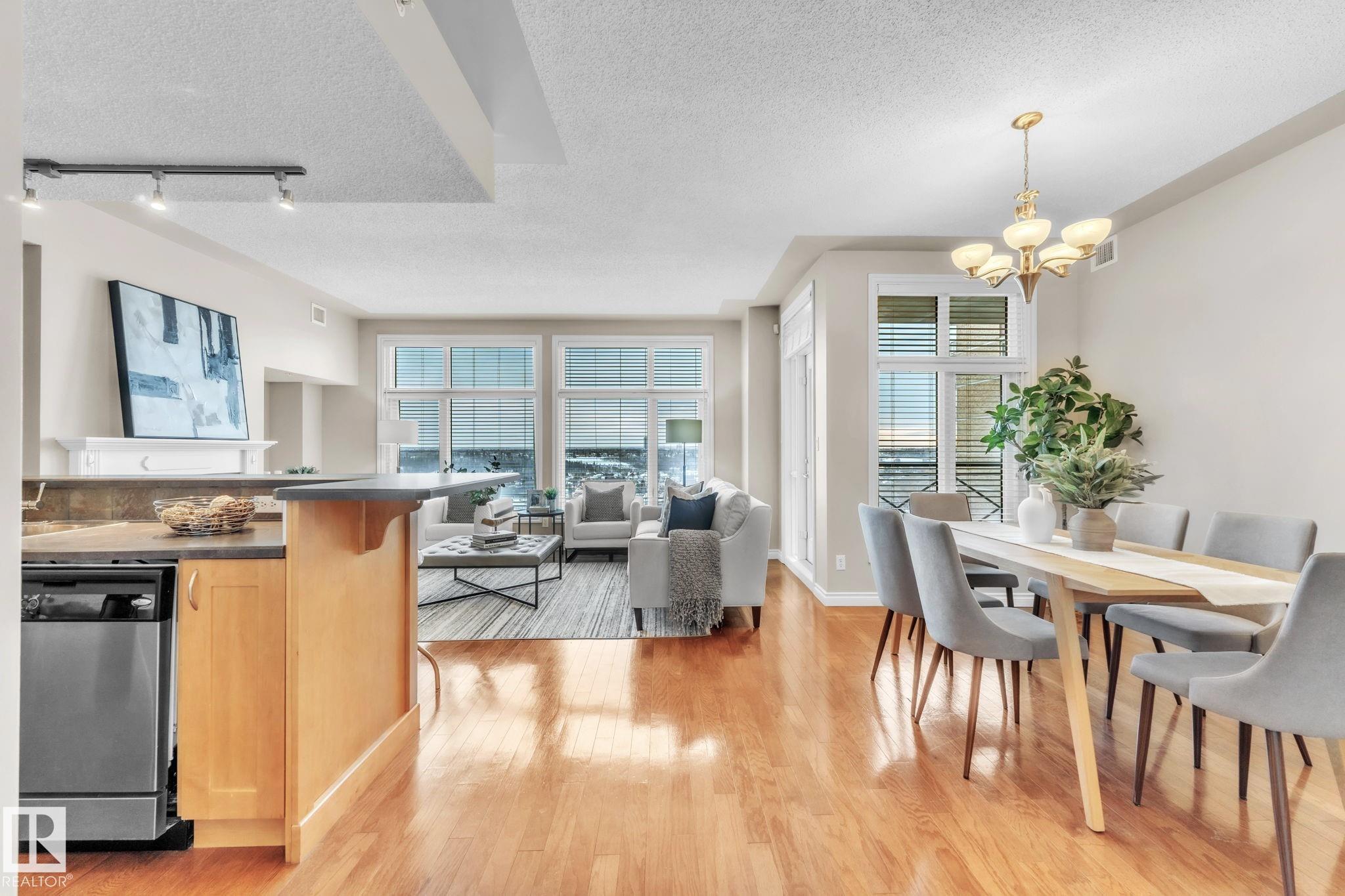 DOWNTOWN EDMONTON CONDO BOASTING SPECTACULAR RIVER VALLEY VIEWS & 2 PARKING STALLS! This 7th-floor, 1,164 sq. ft. condo features 1 bedroom + den, 2 full baths, and 2 side-by-side parking stalls (located on P2, 142 & 176), each with 2 large, lockable storage cages (252 & 253). Features include 9' ceilings, hardwood floors, NEW floor-to-ceiling energy-efficient TRIPLE PAIN WINDOWS, A/C, a gas fireplace, Hunter Douglas blinds, and a LARGE SOUTHEAST covered deck w/gas BBQ hookup that offers unrestricted views of the River Valley! Open kitchen with Maple cabinets and deluxe stainless-steel appliances. The master bedroom has patio doors, a 4-piece ensuite with a separate shower and a soaker tub, and a large walk-in closet. Double French doors lead to the den, which is ideal for an office or bedroom. Building amenities: an exercise room & a gated community. Condo Fees $877 mo. heat+water+electricity. Perfect location for professionals working Downtown, or retirees who enjoy dining, Rogers Place, and the Stadium.